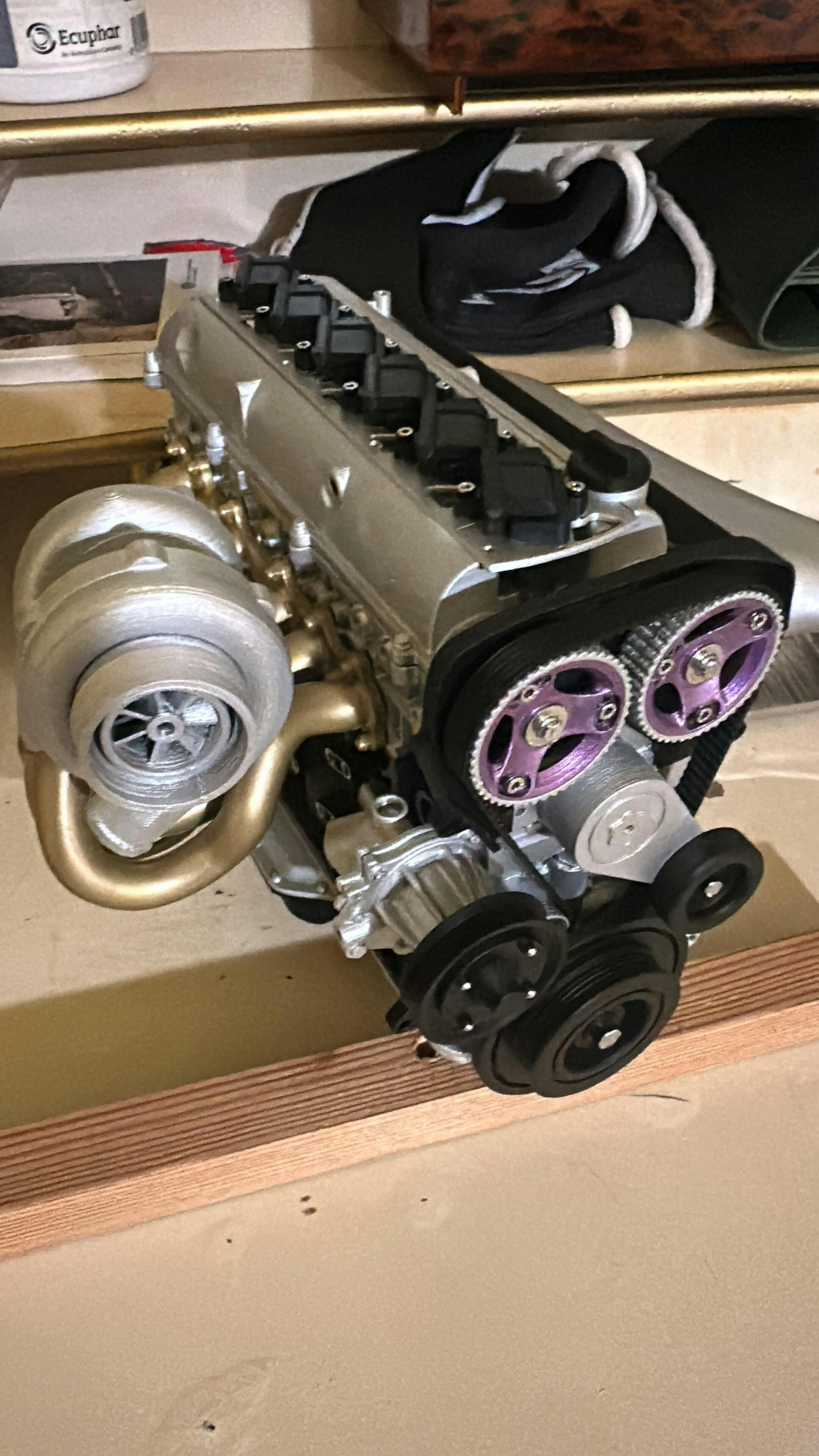 1/4 scale 2JZ-GTE tuned engine replica. One the most iconic JDM engines of all time wich powered cars like the Toyota Supra MKIV, Toyota Aristo... but is also swapped into many other cars.